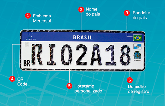 A nova placa possui mais tecnologia e elementos de segurança. Ao invés de 3 letras e 4 números, como é atualmente, as novas placas têm 3 letras, 1 número, 1 letra e 2 números (BRA 3A18).